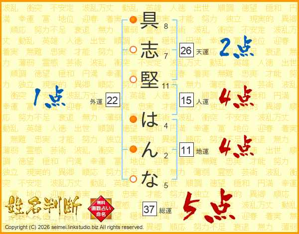具(8画)志(7画)堅(11画) は(4画)ん(2画)な(5画)