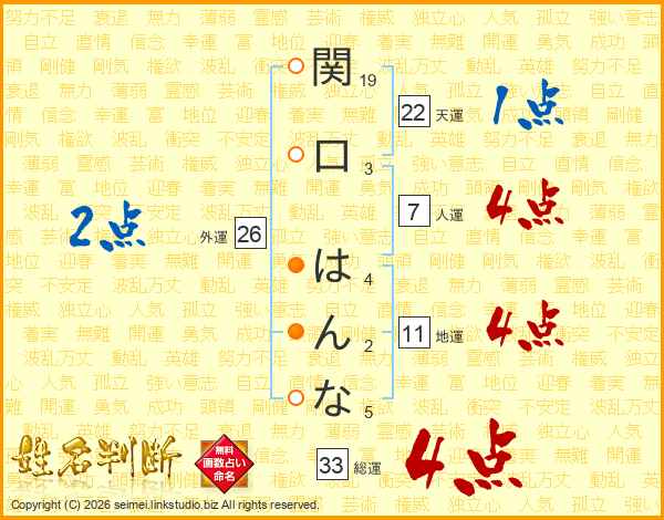関(19画)口(3画) は(4画)ん(2画)な(5画)