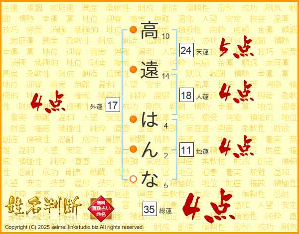 高(10画)遠(14画) は(4画)ん(2画)な(5画)