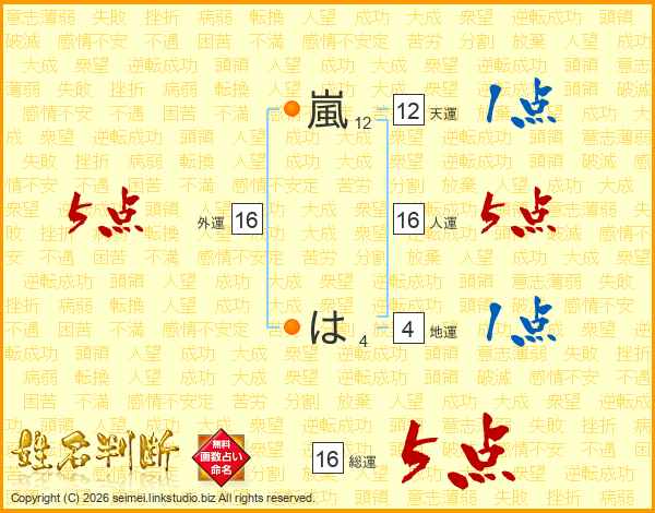 あなたの人生を表す1番重要な運勢です。生涯を通じて影響する総合運となり、主に50歳以降の晩年期に影響を及ぼします。苗字と名前の合計画数。