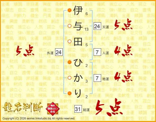 伊(6画)与(13画)田(5画) ひ(2画)か(3画)り(2画)