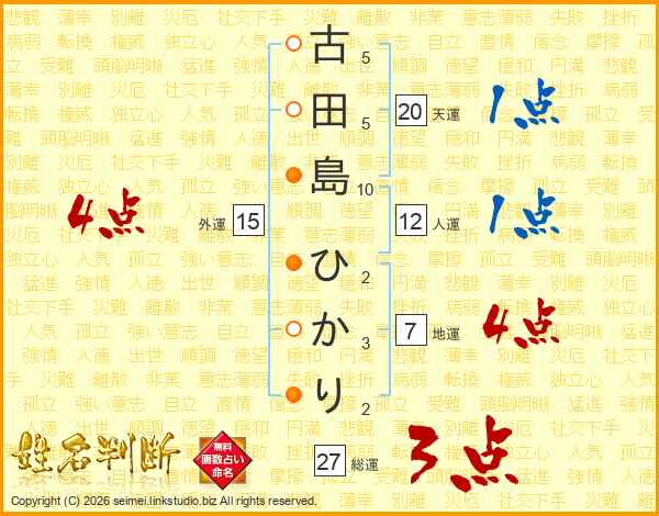 古(5画)田(5画)島(10画) ひ(2画)か(3画)り(2画)