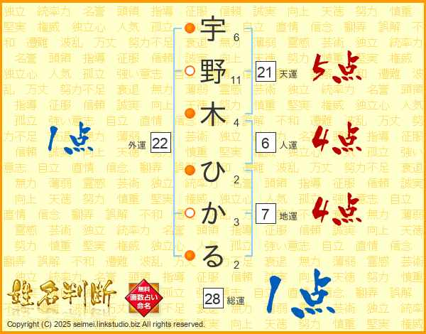 宇(6画)野(11画)木(4画) ひ(2画)か(3画)る(2画)