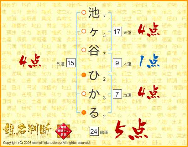 生活面を象徴する運勢です。外部から受ける影響力を表し、結婚運、家庭運や職場、環境への順応性を表します。総運から人運を引いた画数。姓や名が1文字の場合を除く。