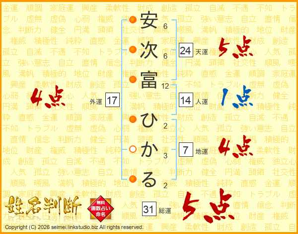 安(6画)次(6画)富(12画) ひ(2画)か(3画)る(2画)