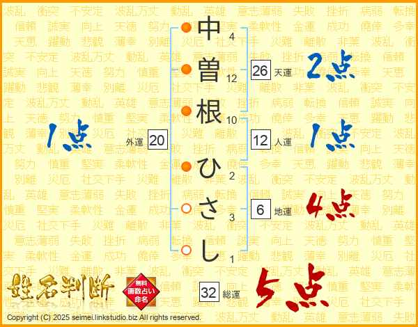 中(4画)曽(12画)根(10画) ひ(2画)さ(3画)し(1画)
