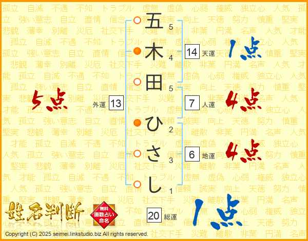生活面を象徴する運勢です。外部から受ける影響力を表し、結婚運、家庭運や職場、環境への順応性を表します。総運から人運を引いた画数。姓や名が1文字の場合を除く。