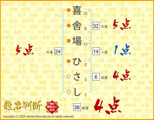 喜(12画)舎(8画)場(12画) ひ(2画)さ(3画)し(1画)