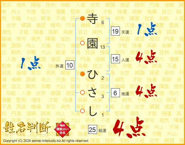 寺園ひさしさんの総運は25画の4点!