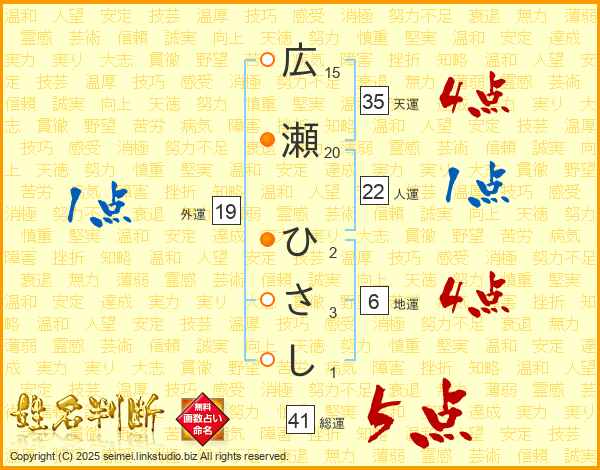 生活面を象徴する運勢です。外部から受ける影響力を表し、結婚運、家庭運や職場、環境への順応性を表します。総運から人運を引いた画数。姓や名が1文字の場合を除く。