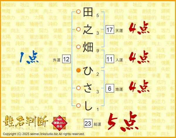 田(5画)之(3画)畑(9画) ひ(2画)さ(3画)し(1画)
