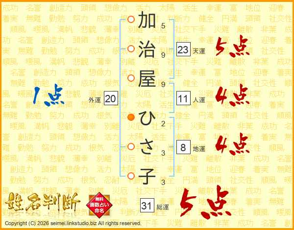 加(5画)治(9画)屋(9画) ひ(2画)さ(3画)子(3画)