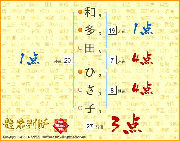生活面を象徴する運勢です。外部から受ける影響力を表し、結婚運、家庭運や職場、環境への順応性を表します。総運から人運を引いた画数。姓や名が1文字の場合を除く。