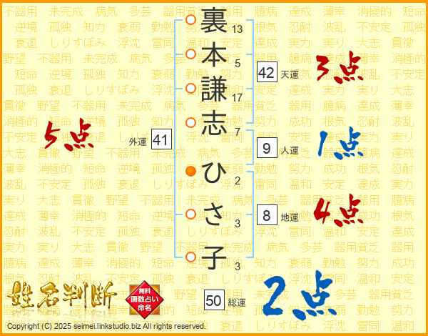 裏(13画)本(5画)謙(17画)志(7画) ひ(2画)さ(3画)子(3画)