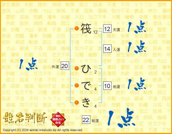 生活面を象徴する運勢です。外部から受ける影響力を表し、結婚運、家庭運や職場、環境への順応性を表します。総運から人運を引いた画数。姓や名が1文字の場合を除く。