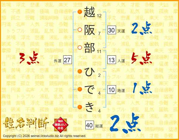 生活面を象徴する運勢です。外部から受ける影響力を表し、結婚運、家庭運や職場、環境への順応性を表します。総運から人運を引いた画数。姓や名が1文字の場合を除く。