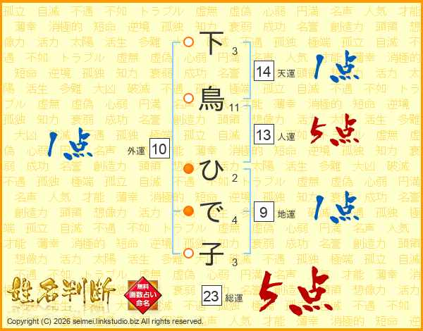 下(3画)鳥(11画) ひ(2画)で(4画)子(3画)