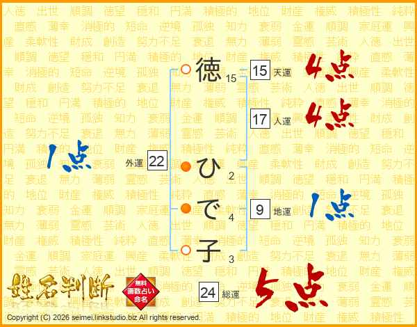 生活面を象徴する運勢です。外部から受ける影響力を表し、結婚運、家庭運や職場、環境への順応性を表します。総運から人運を引いた画数。姓や名が1文字の場合を除く。