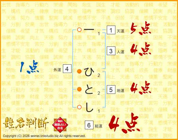 生活面を象徴する運勢です。外部から受ける影響力を表し、結婚運、家庭運や職場、環境への順応性を表します。総運から人運を引いた画数。姓や名が1文字の場合を除く。