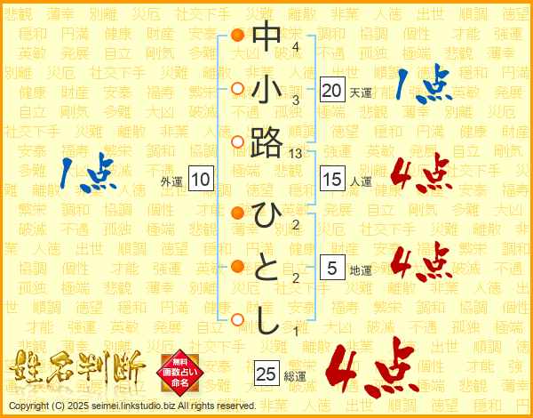 生活面を象徴する運勢です。外部から受ける影響力を表し、結婚運、家庭運や職場、環境への順応性を表します。総運から人運を引いた画数。姓や名が1文字の場合を除く。