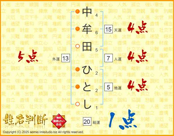 生活面を象徴する運勢です。外部から受ける影響力を表し、結婚運、家庭運や職場、環境への順応性を表します。総運から人運を引いた画数。姓や名が1文字の場合を除く。