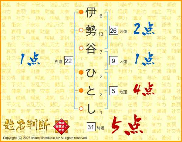 あなたの人生を表す1番重要な運勢です。生涯を通じて影響する総合運となり、主に50歳以降の晩年期に影響を及ぼします。苗字と名前の合計画数。