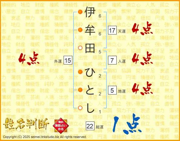 伊(6画)牟(6画)田(5画) ひ(2画)と(2画)し(1画)