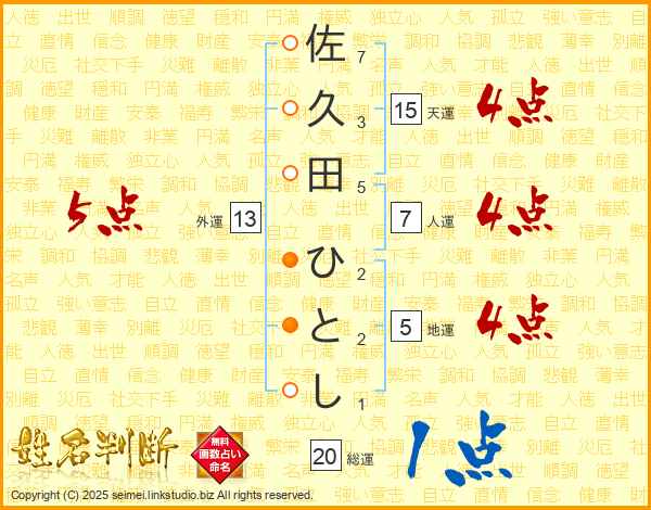 生活面を象徴する運勢です。外部から受ける影響力を表し、結婚運、家庭運や職場、環境への順応性を表します。総運から人運を引いた画数。姓や名が1文字の場合を除く。