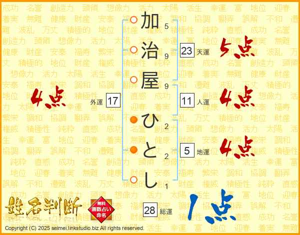 加(5画)治(9画)屋(9画) ひ(2画)と(2画)し(1画)
