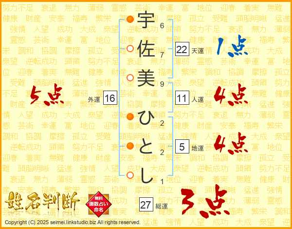 宇(6画)佐(7画)美(9画) ひ(2画)と(2画)し(1画)