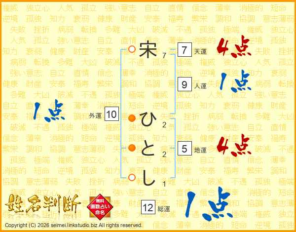 あなたの人生を表す1番重要な運勢です。生涯を通じて影響する総合運となり、主に50歳以降の晩年期に影響を及ぼします。苗字と名前の合計画数。
