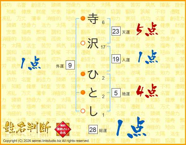 生活面を象徴する運勢です。外部から受ける影響力を表し、結婚運、家庭運や職場、環境への順応性を表します。総運から人運を引いた画数。姓や名が1文字の場合を除く。