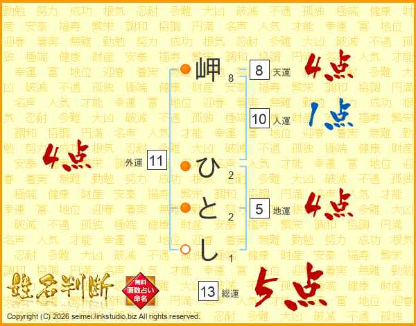 岬ひとしさんの総運は13画の5点!