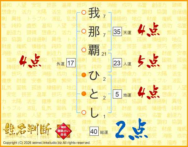 我(7画)那(7画)覇(21画) ひ(2画)と(2画)し(1画)