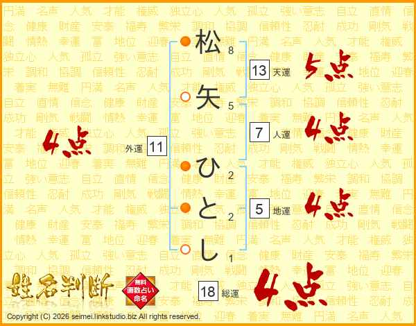 あなたの人生を表す1番重要な運勢です。生涯を通じて影響する総合運となり、主に50歳以降の晩年期に影響を及ぼします。苗字と名前の合計画数。