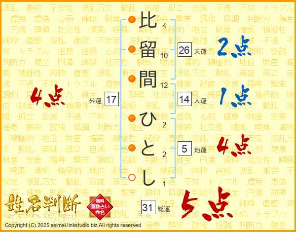 生活面を象徴する運勢です。外部から受ける影響力を表し、結婚運、家庭運や職場、環境への順応性を表します。総運から人運を引いた画数。姓や名が1文字の場合を除く。