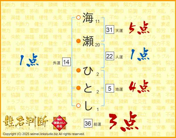 生活面を象徴する運勢です。外部から受ける影響力を表し、結婚運、家庭運や職場、環境への順応性を表します。総運から人運を引いた画数。姓や名が1文字の場合を除く。