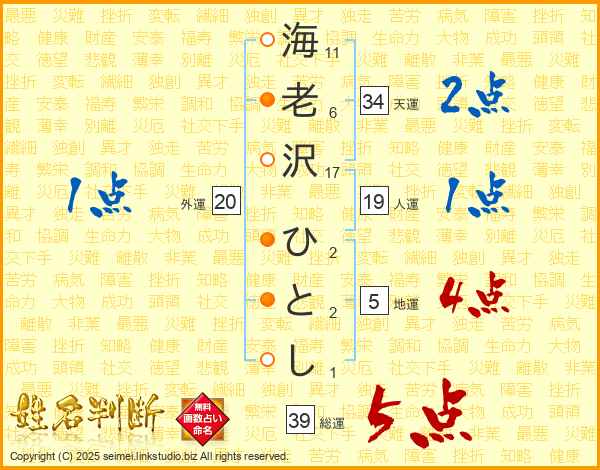 あなたの人生を表す1番重要な運勢です。生涯を通じて影響する総合運となり、主に50歳以降の晩年期に影響を及ぼします。苗字と名前の合計画数。
