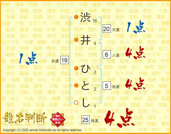 渋(16画)井(4画) ひ(2画)と(2画)し(1画)