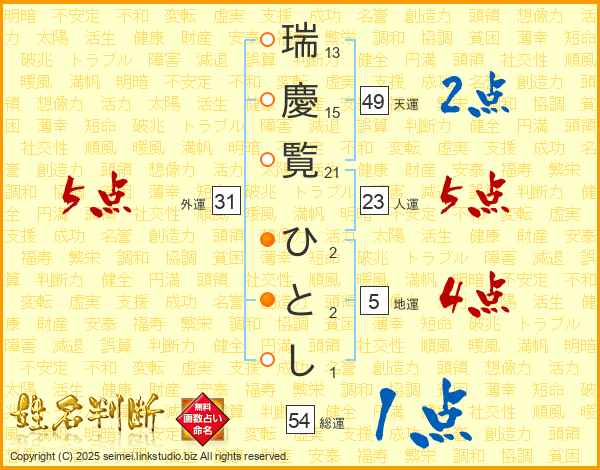 瑞(13画)慶(15画)覧(21画) ひ(2画)と(2画)し(1画)