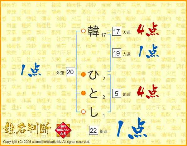 韓ひとしさんの総運は22画の1点!