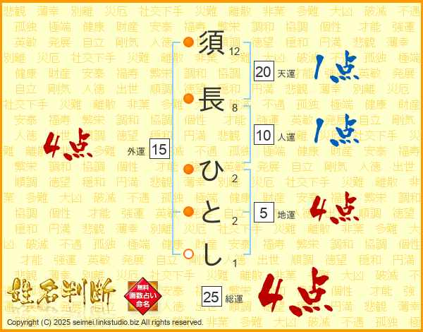あなたの人生を表す1番重要な運勢です。生涯を通じて影響する総合運となり、主に50歳以降の晩年期に影響を及ぼします。苗字と名前の合計画数。