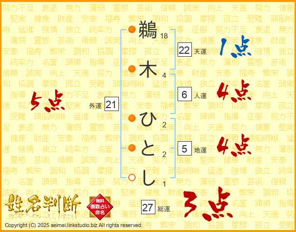 あなたの人生を表す1番重要な運勢です。生涯を通じて影響する総合運となり、主に50歳以降の晩年期に影響を及ぼします。苗字と名前の合計画数。