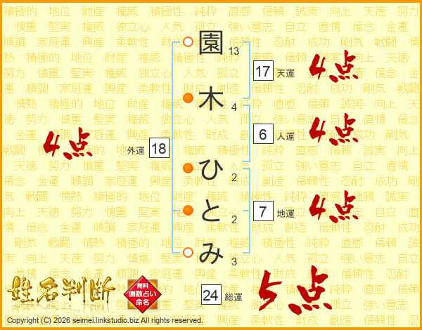 園木ひとみさんの天運は17画の4点!