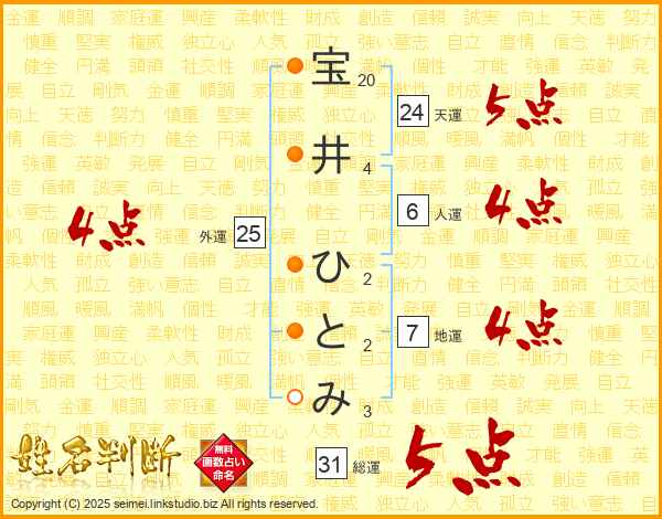 宝(20画)井(4画) ひ(2画)と(2画)み(3画)