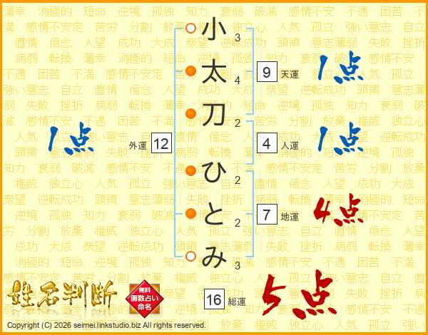 小(3画)太(4画)刀(2画) ひ(2画)と(2画)み(3画)