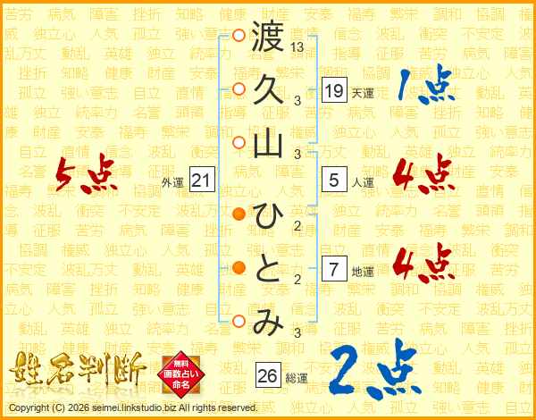 渡(13画)久(3画)山(3画) ひ(2画)と(2画)み(3画)