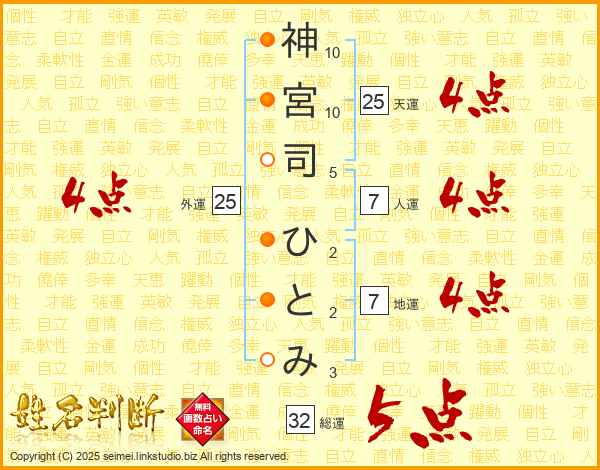 神(10画)宮(10画)司(5画) ひ(2画)と(2画)み(3画)