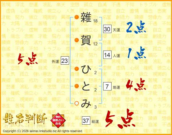 雜(18画)賀(12画)  ひ(2画)と(2画)み(3画)