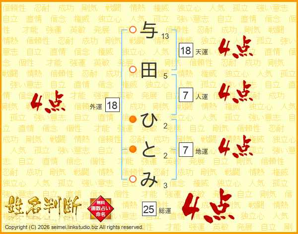 生活面を象徴する運勢です。外部から受ける影響力を表し、結婚運、家庭運や職場、環境への順応性を表します。総運から人運を引いた画数。姓や名が1文字の場合を除く。